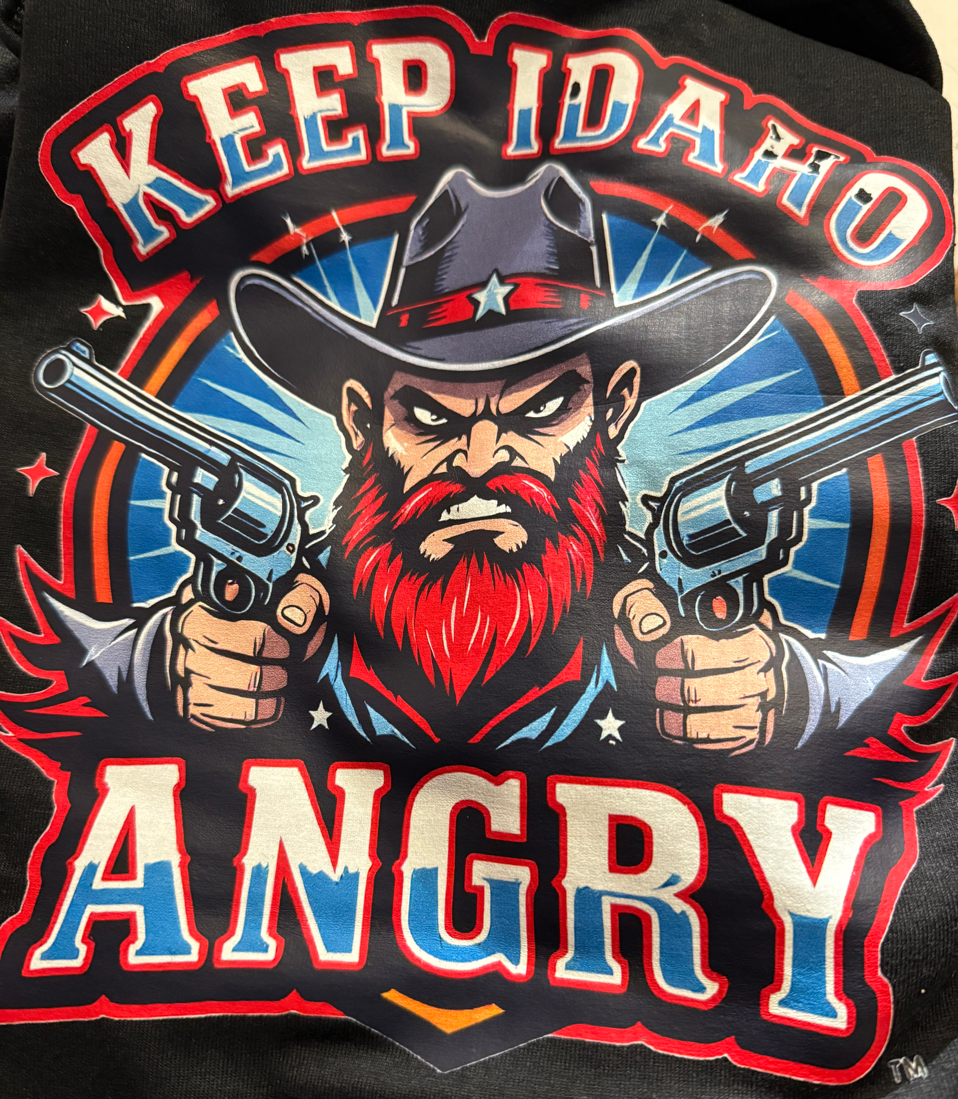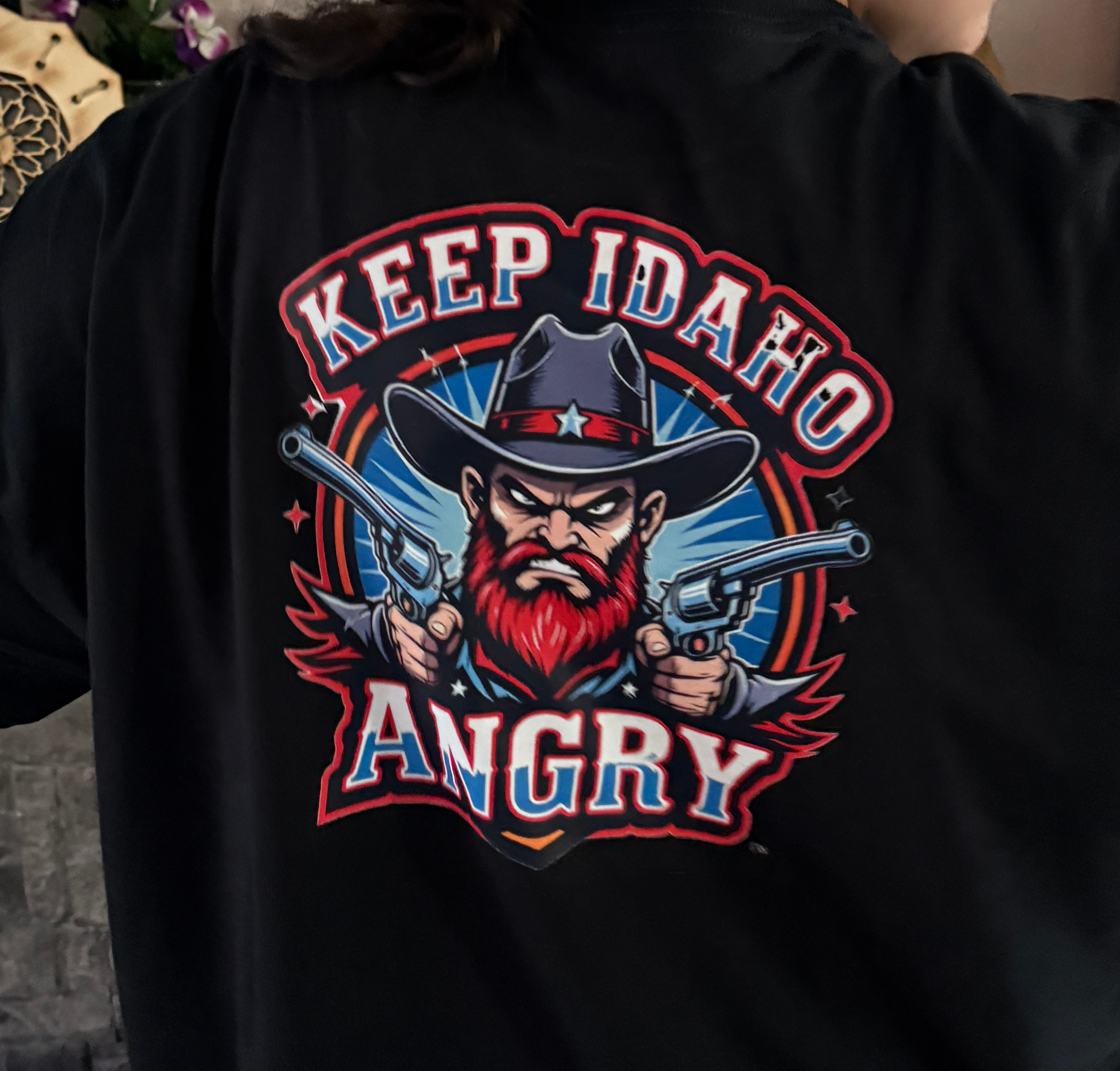 Show off your wild side with the Keep Idaho Angry tee, a bold statement piece by Taylor's Oldtown Farmhouse. Featuring a rugged gunslinger graphic with fiery detail, this shirt channels frontier grit and unapologetic Idaho pride.