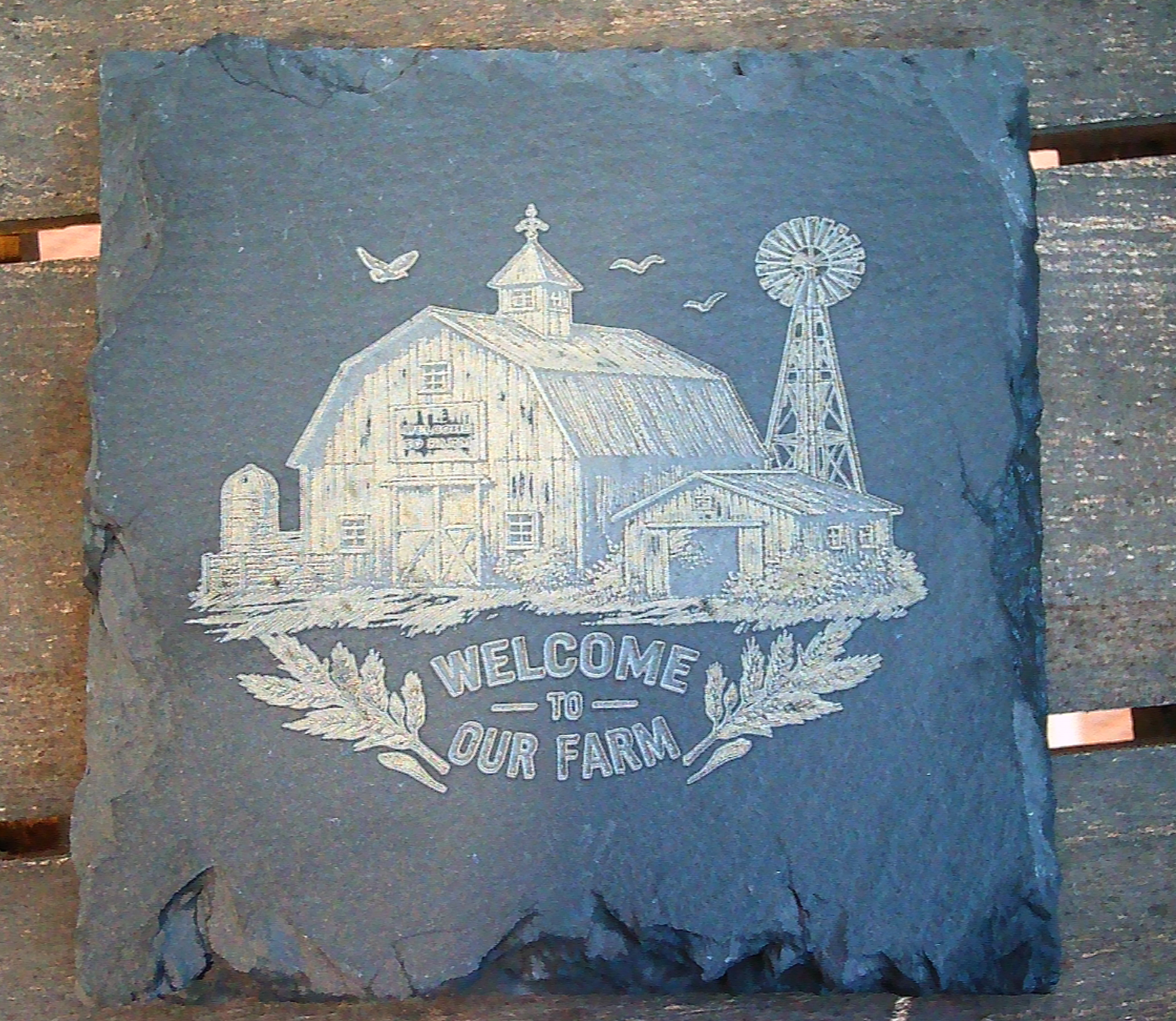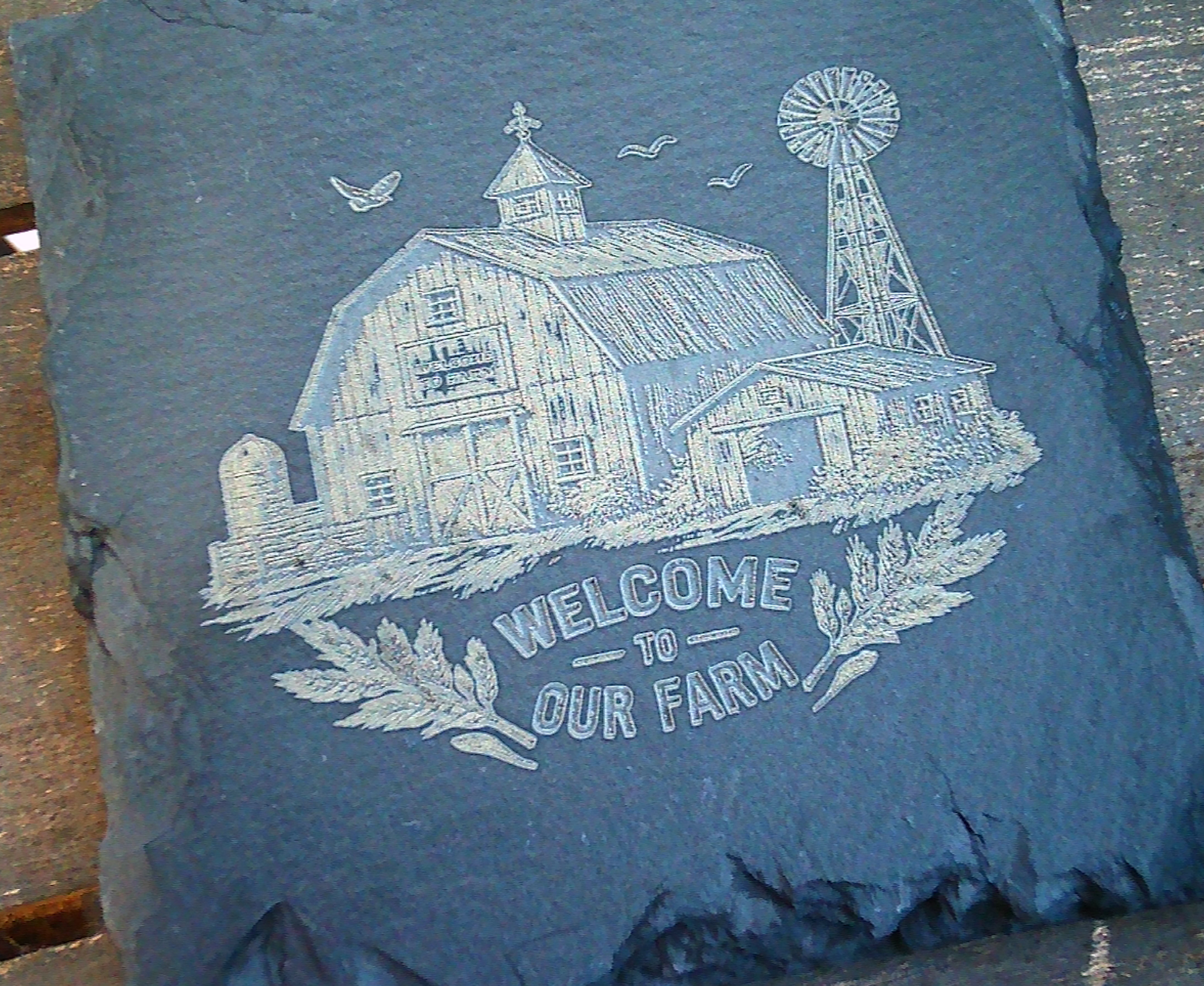 Bring the beauty of a pastoral landscape right to your fingertips with the "Welcome to our Farm" slate coaster set. Crafted in the USA, this 4" x 4" coaster features a deep-engraved image of a charming barn, windmill, and birds, transporting you to a serene countryside escape.